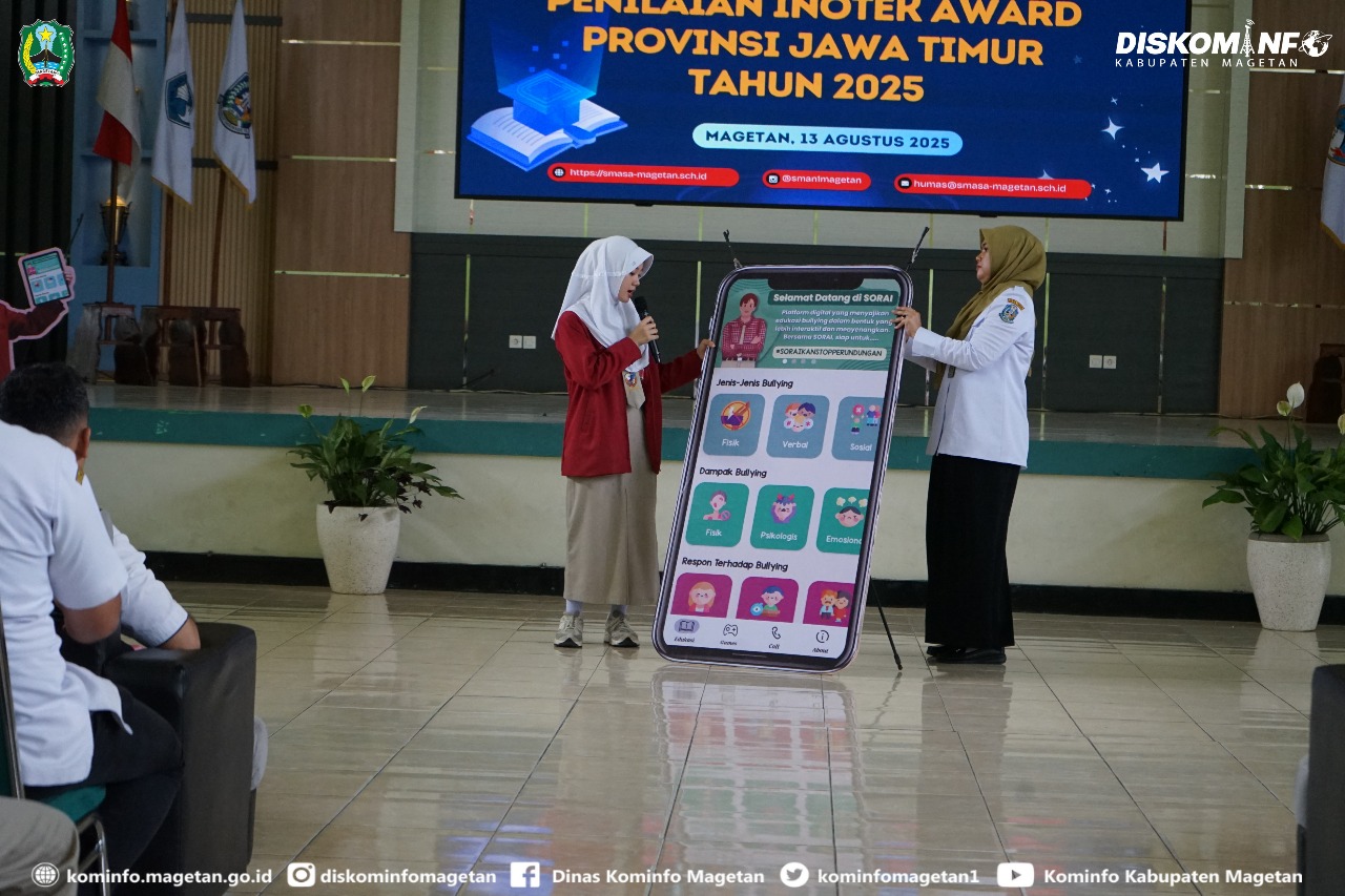 SMA Negeri 1 Magetan kembali menorehkan prestasi di tingkat Provinsi Jawa Timur. Sekolah ini berhasil masuk 6 besar Kompetisi Inovasi dan Teknologi (Inotek Award) Provinsi Jatim 2025 melalui inovasi aplikasi “SORA” (Sobat Remaja Anti Bullying), sebuah aplikasi berbasis Android yang dirancang untuk memberikan edukasi anti perundungan di kalangan pelajar.