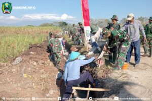 Magetan. Prajurit Kodim 0804/Magetan yang tergabung dalam Satgas Pra Tentara Manunggal Membangun Desa (TMMD) ke-126 bersama masyarakat saling bahu-membahu bergotong-royong mulai pekerjaan pembangunan talud, di Desa Kembangan, Kec Sukomoro, Kab.