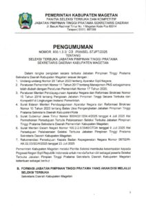 PENGUMUMAN SELEKSI TERBUKA JABATAN PIMPINAN TINGGI PRATAMA SEKRETARIS DAERAH KABUPATEN MAGETAN PENGUMUMANNOMOR 800.1.3.3/ 03 /PANSEL-STJPT/2025TENTANGSELEKSI TERBUKA JABATAN PIMPINAN TINGGI PRATAMA SEKRETARIS DAERAH KABUPATEN MAGETAN