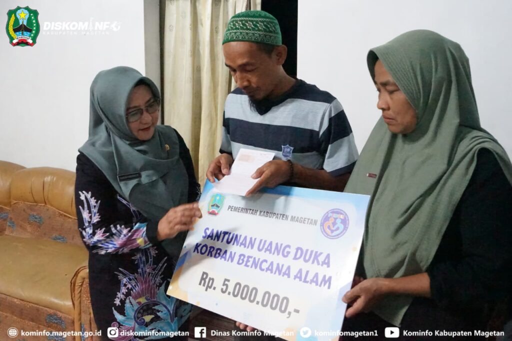 Bupati Magetan hadir secara langsung di lokasi terdampak untuk menyerahkan bantuan berupa uang tunai sebesar Rp5 juta dan sejumlah paket sembako kepada keluarga yang mengalami kerusakan rumah akibat hujan deras yang terjadi beberapa waktu lalu.
