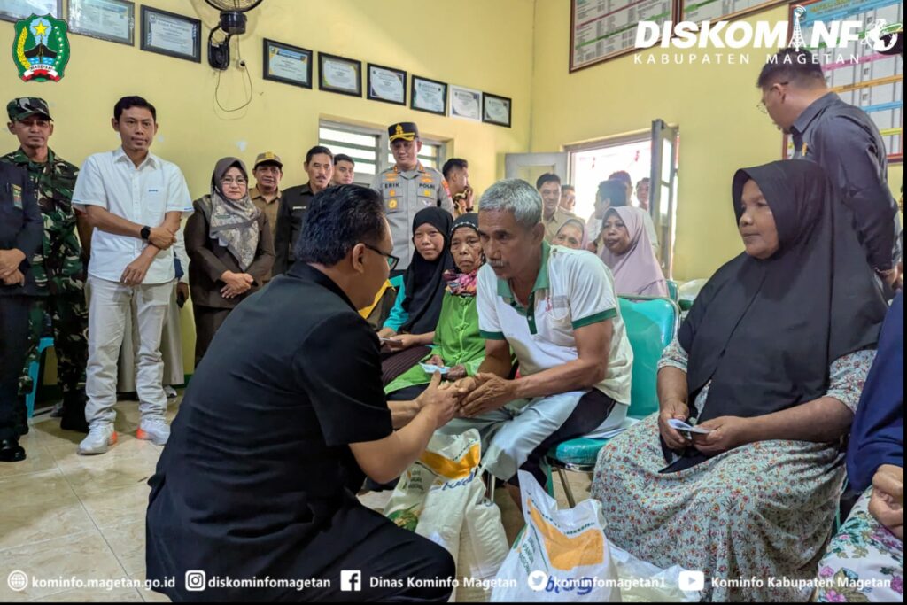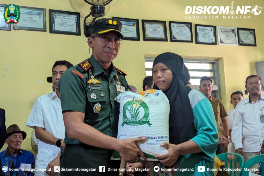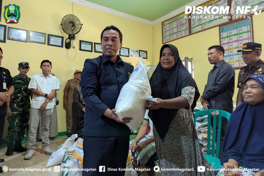 Pemkab Magetan bekerjasama dengan Badan Pangan Nasional, Bulog, TNI dan Polri menyalurkan bantuan beras Cadangan Pangan Pemerintah (CPP) kepada keluarga/masyarakat yang kurang mampu, seperti halnya hari ini disalurkan di Desa Kembangan Kecamatan Sukomoro, Senin (28/7/25).