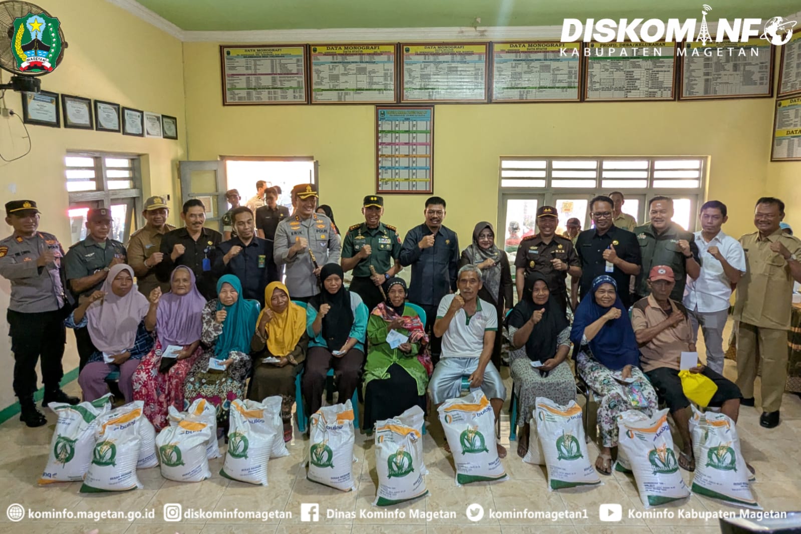 Pemkab Magetan bekerjasama dengan Badan Pangan Nasional, Bulog, TNI dan Polri menyalurkan bantuan beras Cadangan Pangan Pemerintah (CPP) kepada keluarga/masyarakat yang kurang mampu, seperti halnya hari ini disalurkan di Desa Kembangan Kecamatan Sukomoro, Senin (28/7/25).
