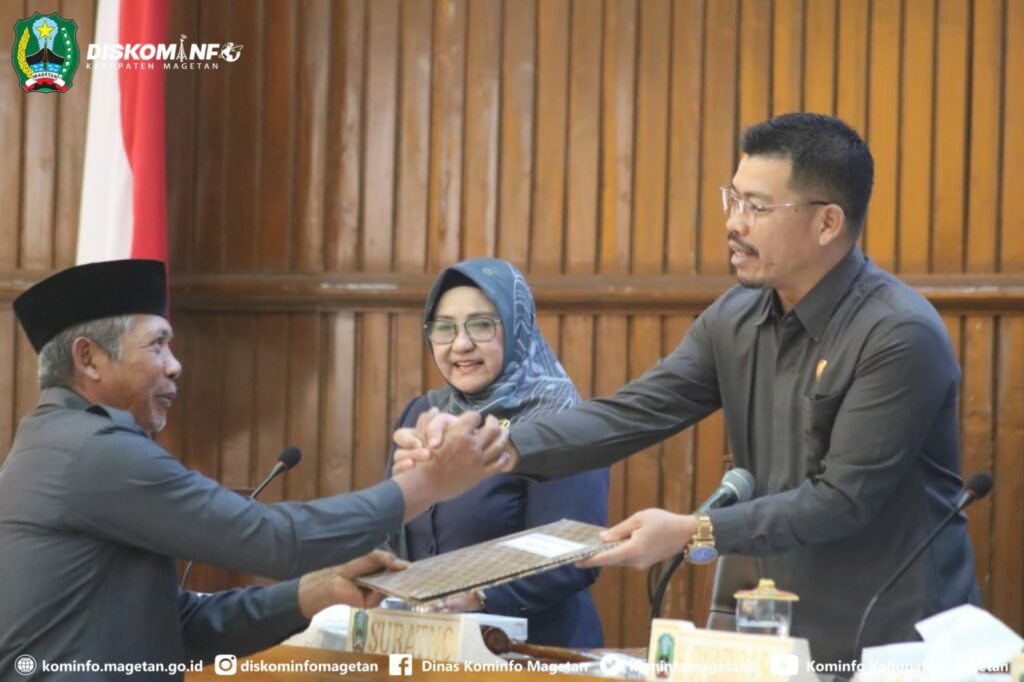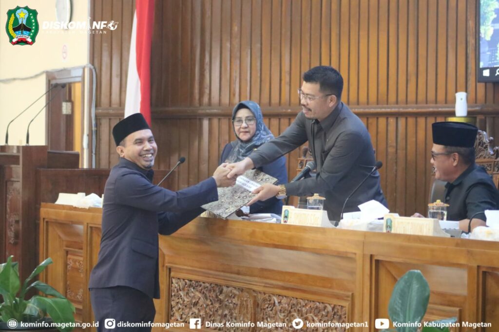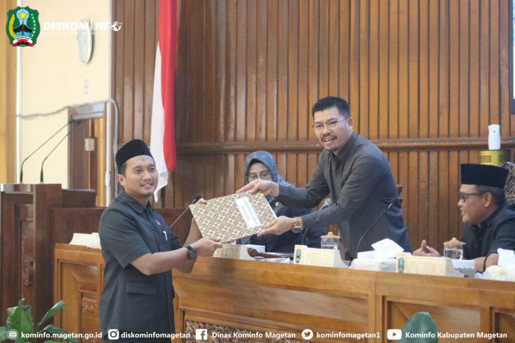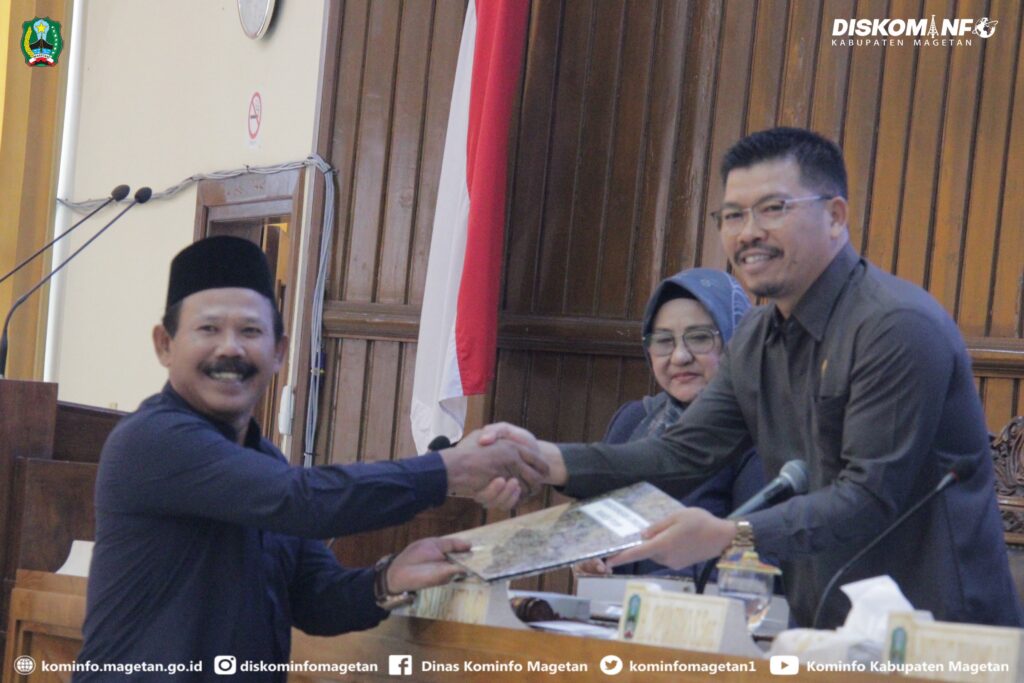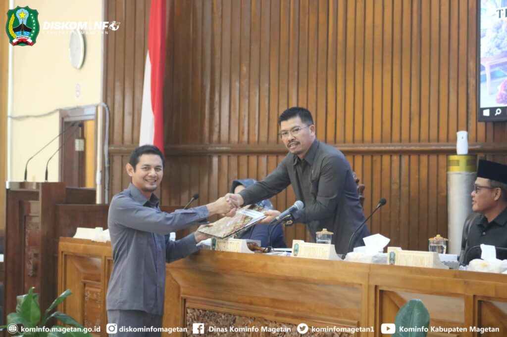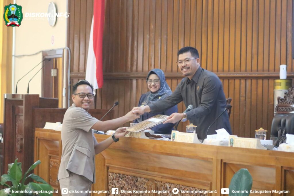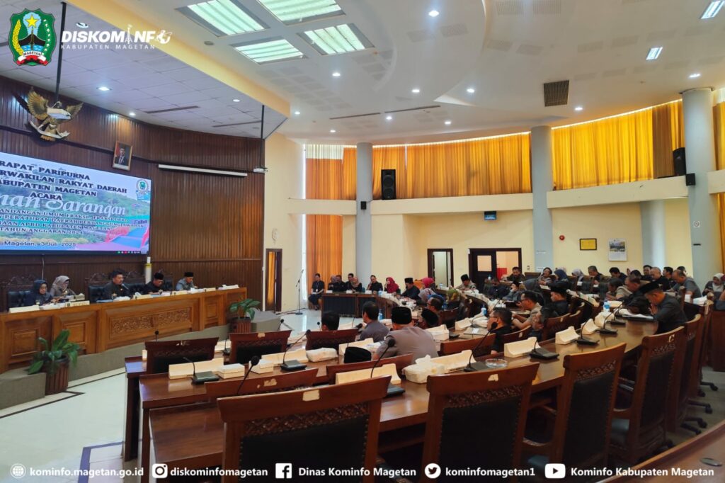 Magetan – Dewan Perwakilan Rakyat Daerah (DPRD) Kabupaten Magetan menggelar rapat paripurna dengan agenda penyampaian pandangan umum fraksi-fraksi terhadap Rancangan Peraturan Daerah (Raperda) tentang Pertanggungjawaban Pelaksanaan Anggaran Pendapatan dan Belanja Daerah (APBD) Tahun Anggaran 2024, Kamis (3/7/2025).