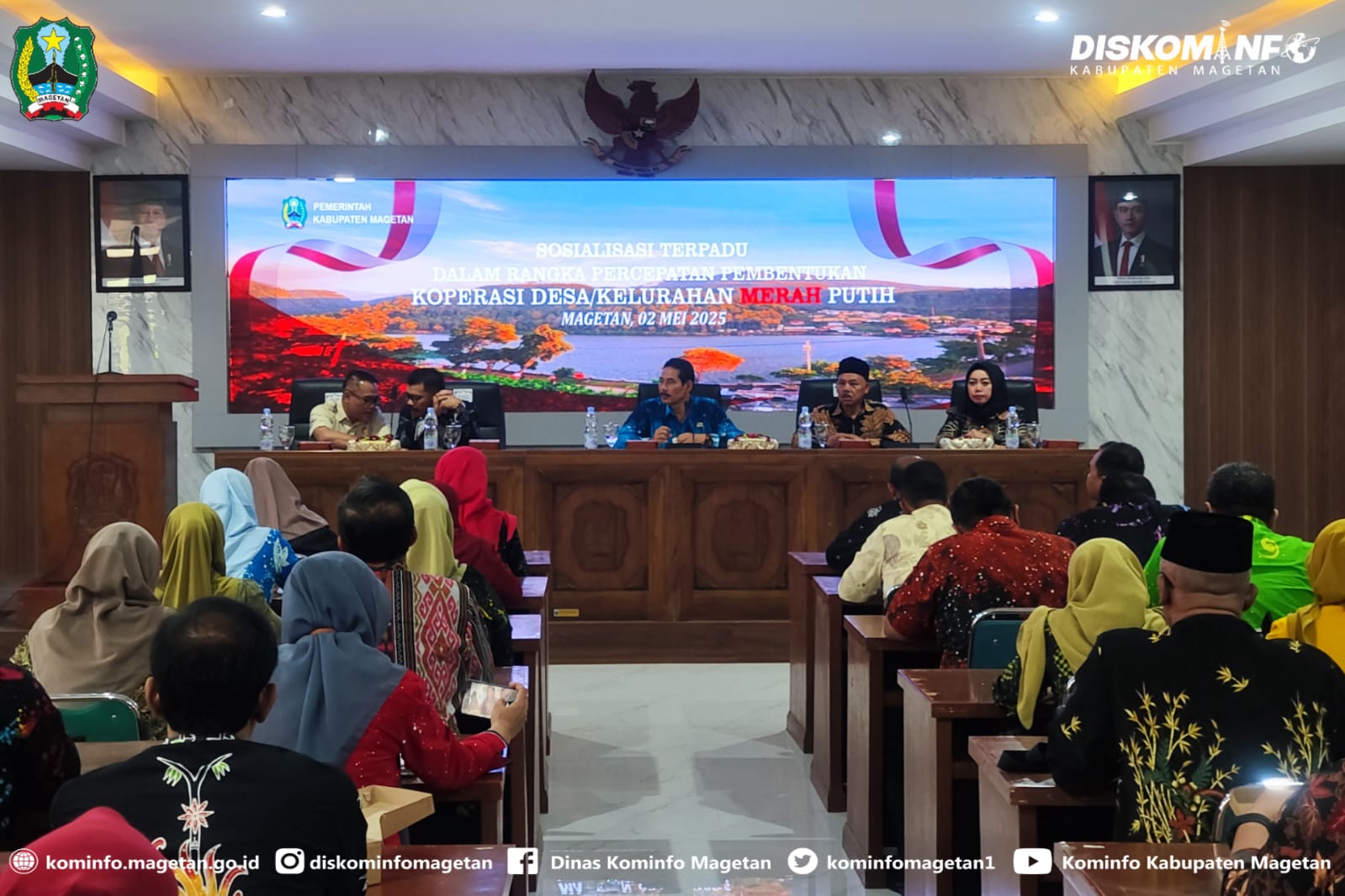 Dukung percepatan pembentukan Koperasi Desa/Kelurahan, pemkab Magetan hari ini gelar Sosialisasi Terpadu di ruang Ki Mageti Jumat (2/5/25). Kegiatan sosialisasi ini diikuti oleh Pj. Sekda Magetan, Ketua DPRD Magetan, Wakil Ketua DPRD Magetan, Komisi B, OPD terkait, Camat dan Lurah se Magetan.