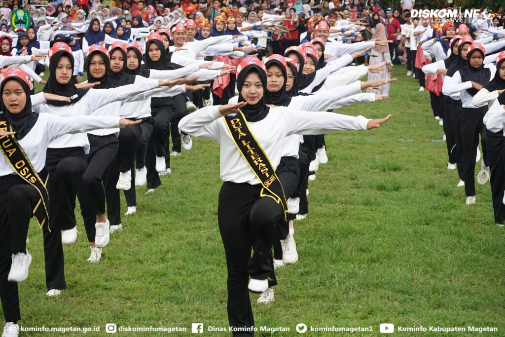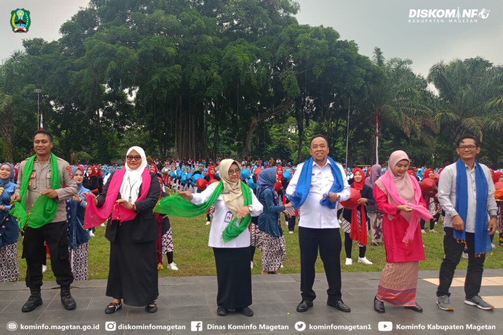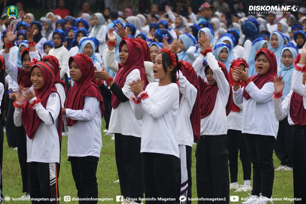 Melebur 2000 Siswa-siswi SD dan SMP se-Kab. Magetan dengan penuh semangat dan energik bersama-sama lakukan gerakan olah raga “Senam Sehat Anak Indonesia Hebat”. Kemeriahan inipun terus berlanjut dengan tampilan “Tari Kolosal Golek Menak” dari 2.400 tenaga pendidik.
