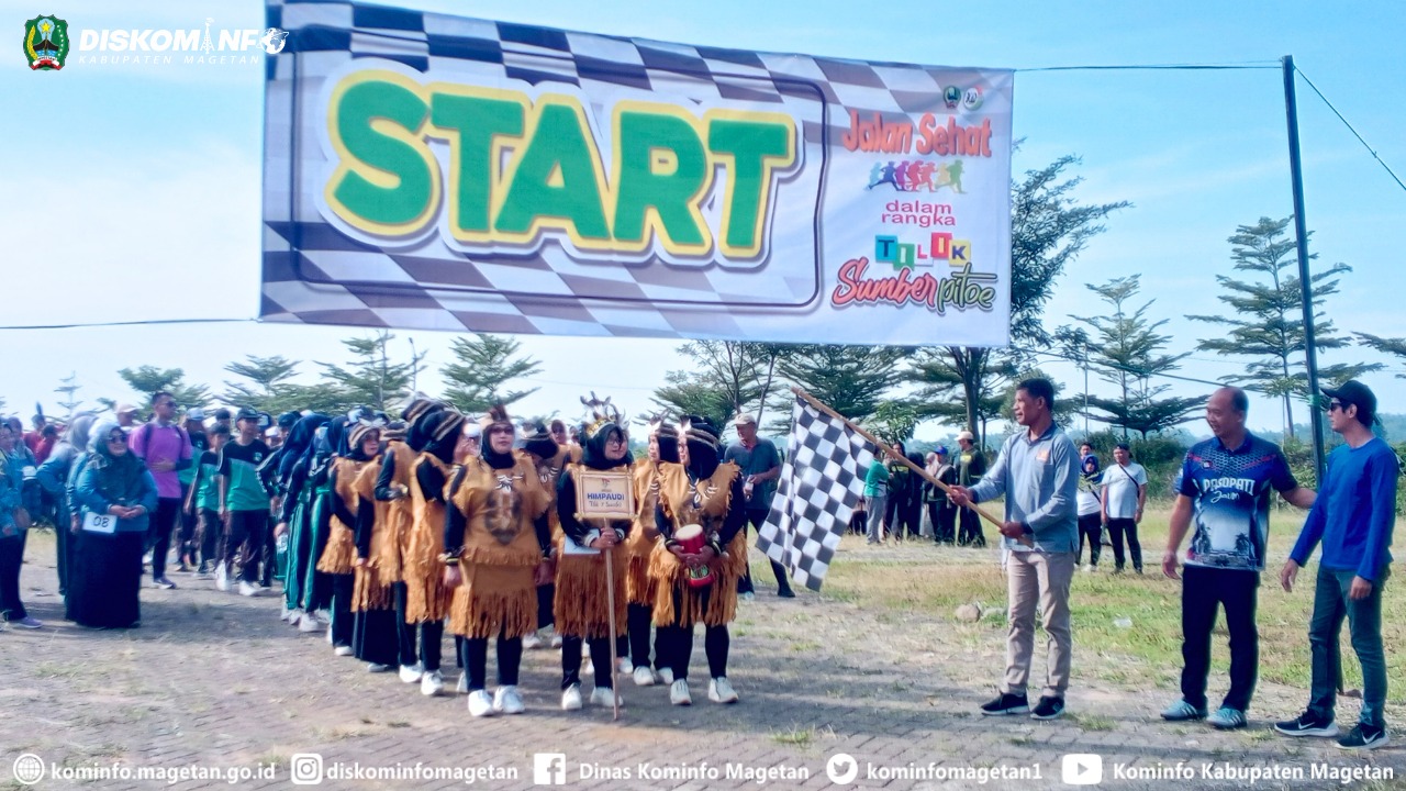 Peserta jalan sehat diberangkatkan secara langsung oleh Bupati Magetan yang diwakili Staf Ahli Bupati Bidang Kemasyarakatan dan SDM Jaka Risdianto, S.H, M.Si dari titik start di Lapangan Desa Sumberdodol.