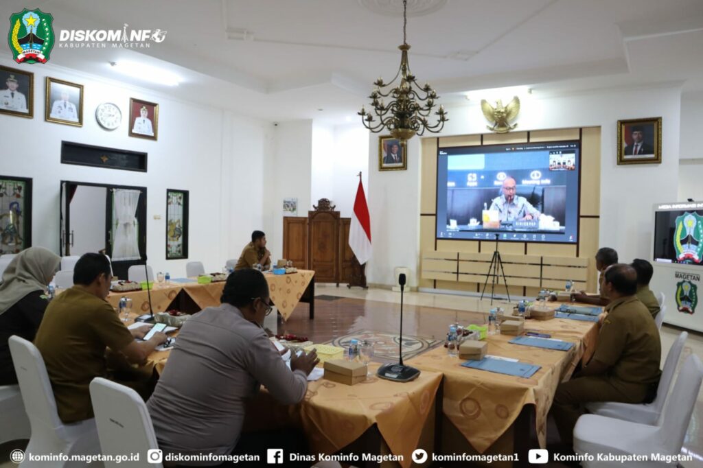 Pemerintah Kabupaten Magetan mengikuti kegiatan ini secara virtual di Ruang Jamuan Pendopo Surya Graha yang dihadiri oleh Asisten Perekonomian dan Pembangunan, perwakilan forkopimda dan OPD terkait.(Diskomimfo:may / fa2 / IKP1)