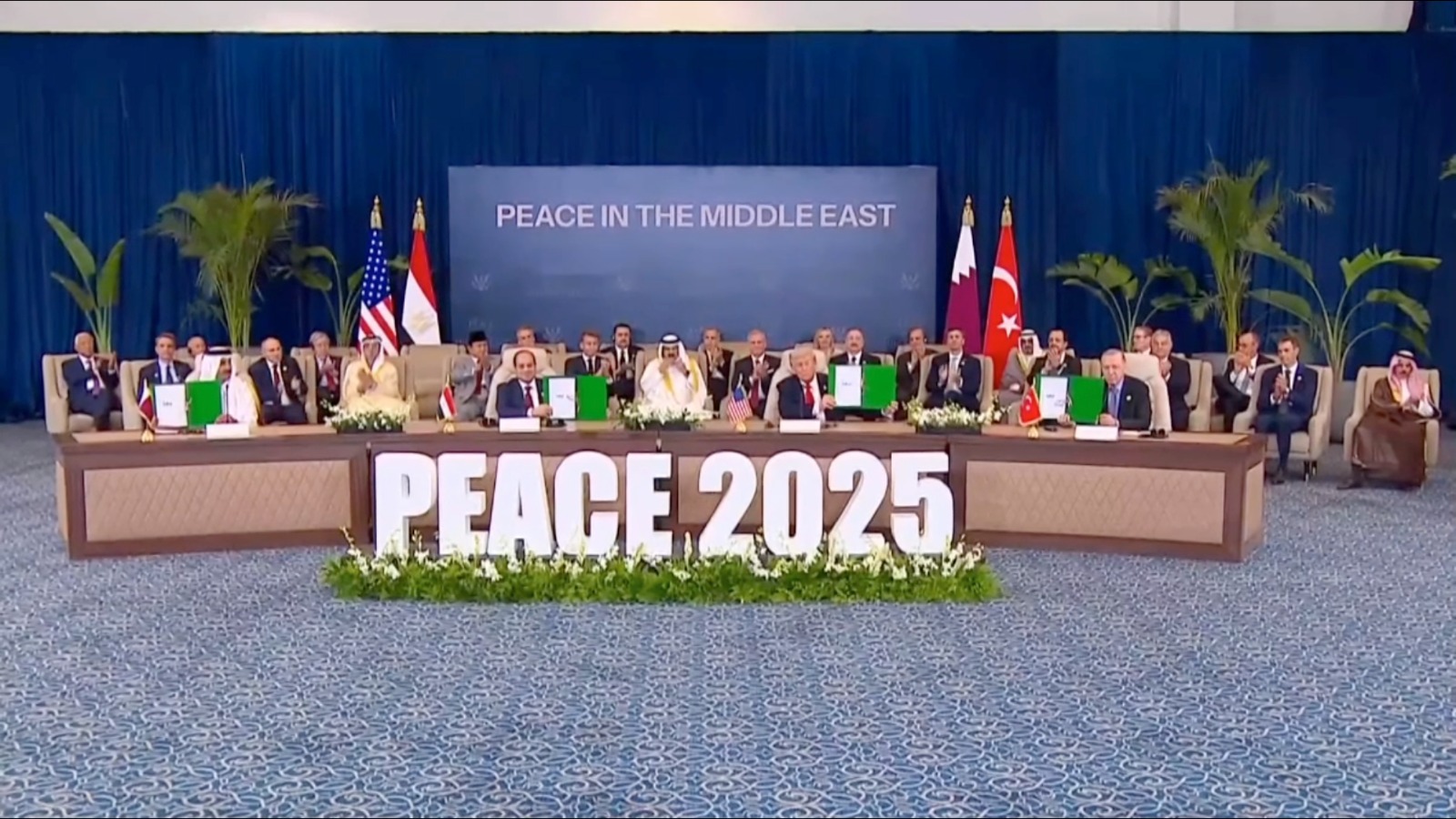 Hadir pada kesempatan itu para pemimpin dunia seperti Trump, Presiden Palestina Mahmoud Abbas, Presiden Mesir Abdel Fattah El-Sisi, Emir Qatar Tamim bin Hamad Al Thani, dan Presiden Turki Recep Tayyip Erdogan.