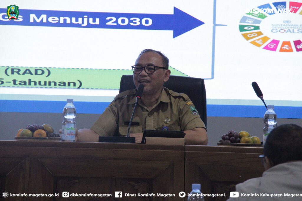 Paparan disampaikan oleh Kepala Bappeda Litbang Kabupaten Magetan, Elmy Kurnianto Widodo, S.T., M.T., yang menyampaikan bahwa arah pembangunan daerah saat ini difokuskan pada pencapaian SDGs, khususnya tujuan ketiga, yakni kesehatan yang baik dan kesejahteraan. Ia menyoroti pentingnya pelayanan kesehatan mata yang inklusif dan berkelanjutan. Elmy berharap ke depan setiap OPD dapat mengambil peran sesuai dengan tugas pokok dan fungsinya, seperti Dinas Sosial yang bisa berkolaborasi dengan puskesmas untuk menyelenggarakan skrining kesehatan mata secara massal bagi masyarakat.