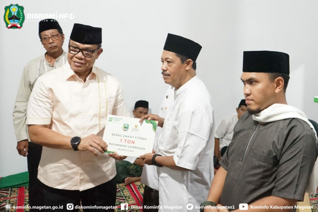 Dalam kesempatan tersebut juga diserahkan secara simbolis bantuan untuk Masjid Roudhotul Jannah serta penyerahan beras zakat fitrah dari Baznas Magetan kepada seluruh camat se-Kecamatan Lembeyan untuk disalurkan kepada yang berhak menerima.