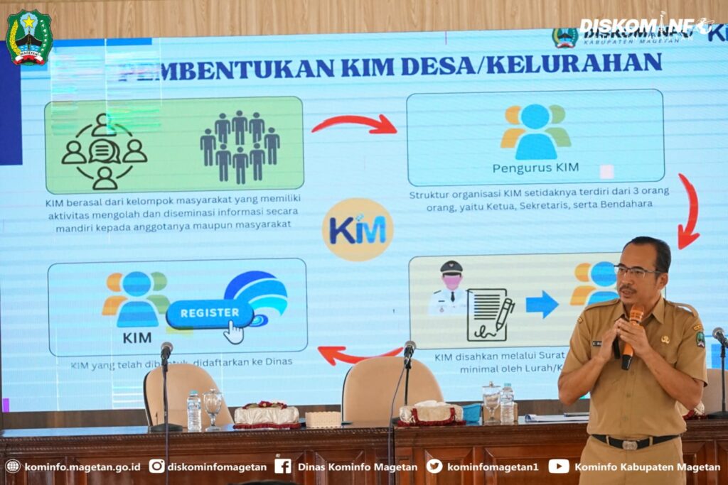 Kepala Bidang IKP (Informasi Komunikasi Publik) Eko Budiono sebagai pemateri menyampaikan, KIM ini sudah lama terbentuk dan di Magetan sedang mati suri, bagaimana pemerintah membangkitkan lagi KIM sebagai kepanjangan tangan pemerintah sebagai desiminasi masyarakat, dimana KIM ini untuk membangun sebuah informasi yang legal dan dapat dipertanggungjawabkan. KIM harus dibentuk oleh, dari, dan untuk masyarakat, berkedudukan di kelurahan/desa, ditetapkan minimal oleh Kepala Desa/Lurah, terdaftar di Dinas Kominfo.