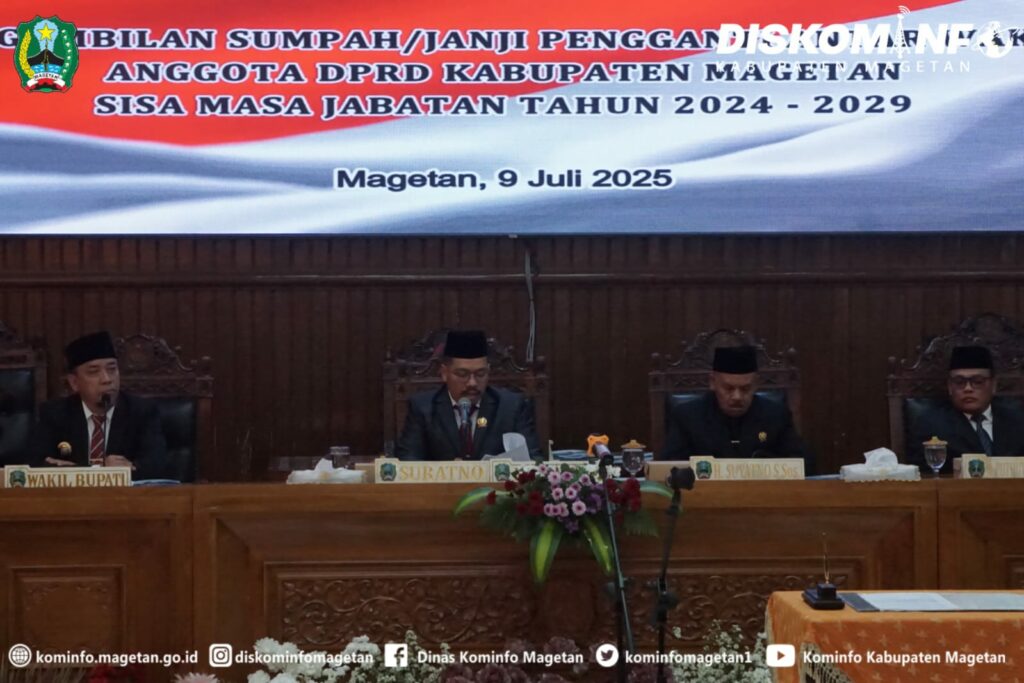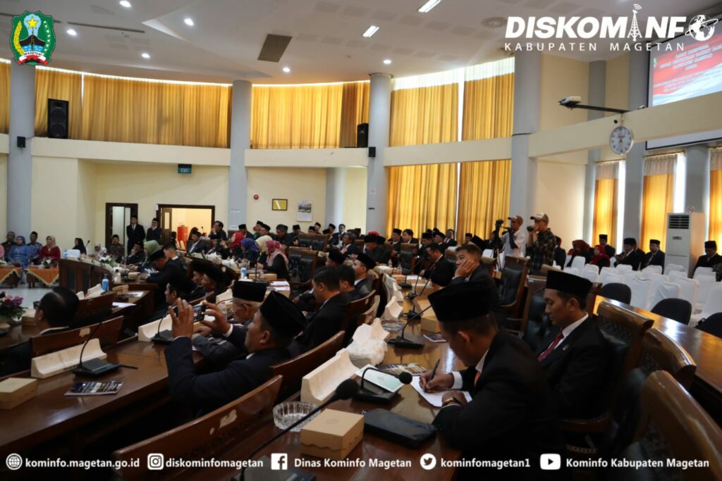 Rapat paripurna DPRD Kabupaten Magetan dalam rangka jawaban bupati atas pandangan umum fraksi-fraksi DPRD terhadap rancangan peraturan daerah tentang pertanggungjawaban pelaksanaan APBD tahun anggaran 2024 dilaksanakan di ruang rapat DPRD Magetan yang diikuti Bupati dan Wakil Bupati Magetan, Forkopimda, Kepala OPD. Rabu (9/7/2025).