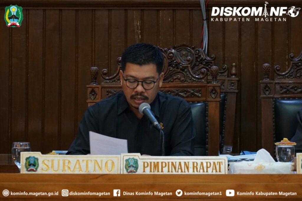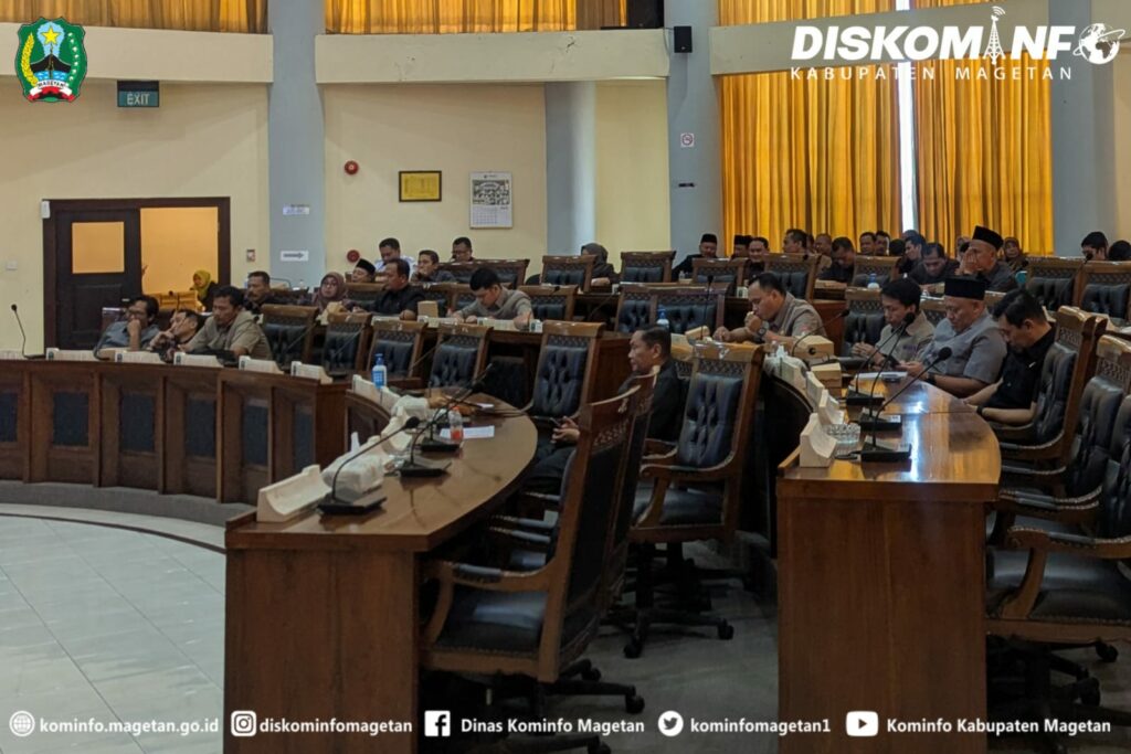 Rapat paripurna DPRD tentang dua raperda Magetan hari ini digelar di ruang paripurna DPRD Magetan, dihadiri oleh Bupati Magetan, Ketua DPRD Magetan, Forkopimda, Pj. Sekda, seluruh OPD dan anggota fraksi, Kamis (7/8/2025).