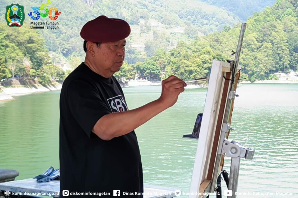 Presiden ke-6 Republik Indonesia, Susilo Bambang Yudhoyono (SBY), mengabadikan keindahan Telaga Sarangan melalui goresan kuas di atas kanvas, Jumat (17/10). Moment SBY melukis di tepi telaga dengan latar Gunung Lawu itu menjadi momen hangat yang kemudian menarik perhatian masyarakat dan wisatawan.