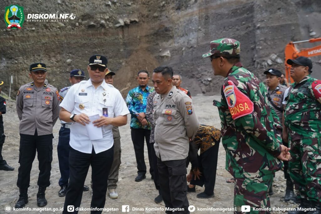 Iring-iringan rombongan Pj. Bupati meluncur menuju arah Parang pagi ini. Bersama Kepala OPD terkait, Pj. Bupati laksanakan sidak terhadap beberapa penambangan di wilayah Magetan. Lokasi tambang pertama yang dikunjungi Pj. Bupati berada di Desa Sayutan, Kecamatan Parang. Dilokasi pertama Pj. Bupati tidak menemukan aktifitas penambangan yang masih berlangsung, dikarenakan sejak kemarin aktifitas penambangan sudah dihentikan oleh perusahaan tambang, Rabu (8/5/25).