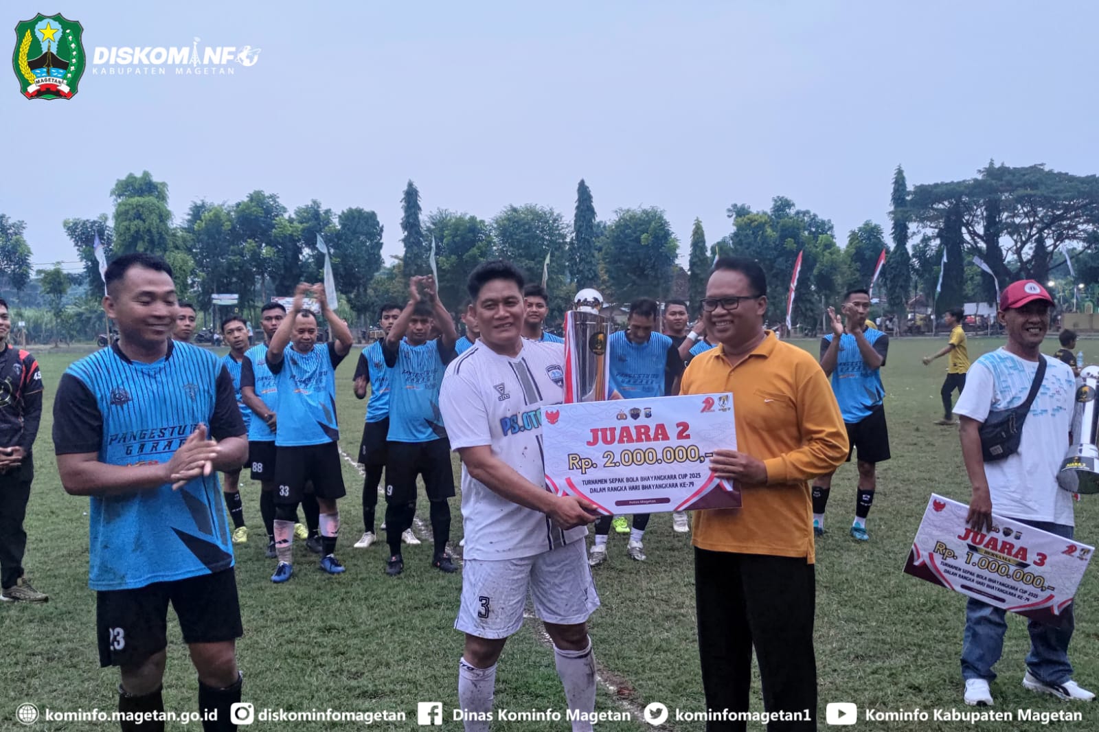Tim sepakbola Pemkab Magetan harus puas menjadi Runner Up pada Turnamen Sepakbola Bhayangkara Cup 2025. Keluar sebagai juara turnamen adalah tim Kopasgat 463 Lanud Iswahjudi, setelah meraih kemenangan meyakinkan atas Pemkab Magetan dengan skor 3-0 pada laga final yang digelar di Lapangan Jaka Umbaran, Desa Pingkuk, Kecamatan Bendo, Minggu (22/6/2025).