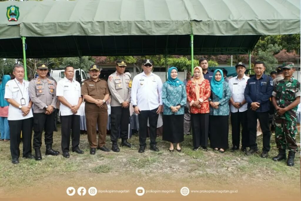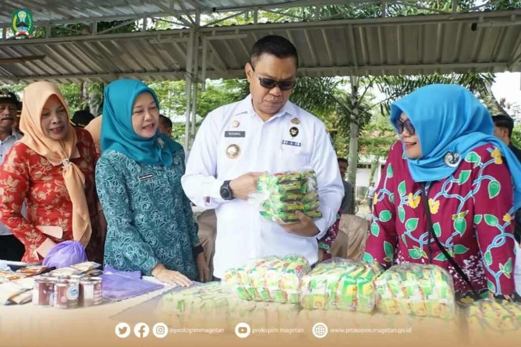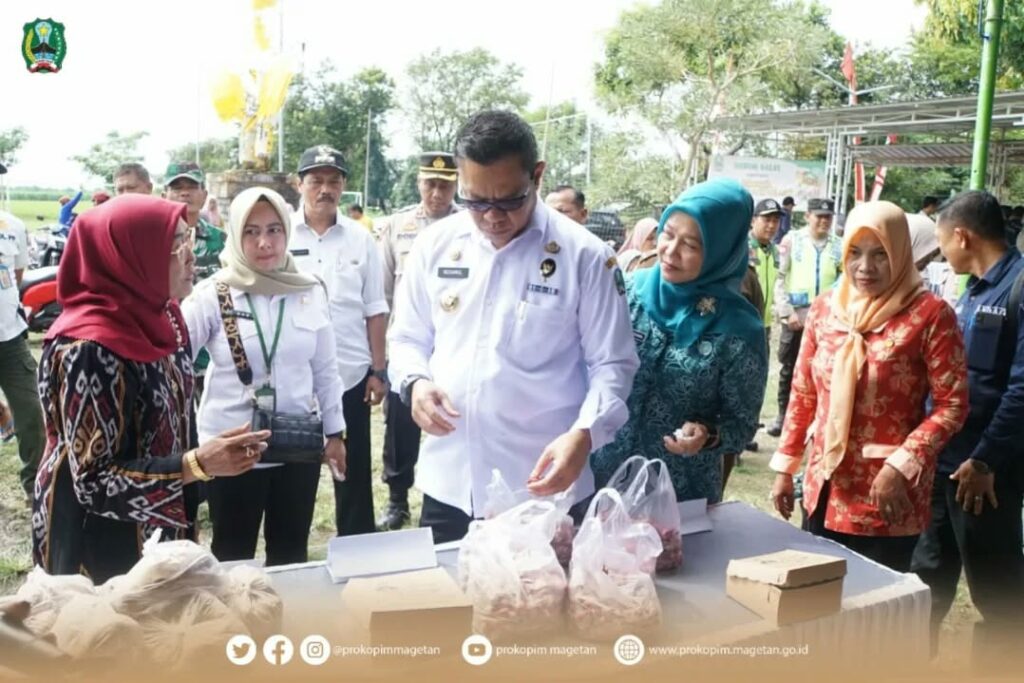Pj Bupati Magetan Nizhamul didampingi Ibu Ketua Tim Penggerak PKK Kabupaten Magetan Arena Sumela bersama perwakilan Forkopimda, meninjau langsung pasar murah yang digelar di Lapangan Desa Lembeyan Wetan, Kecamatan Lembeyan, Rabu (26/02).