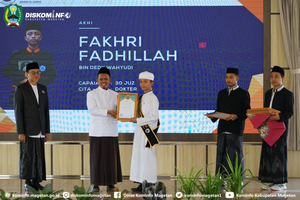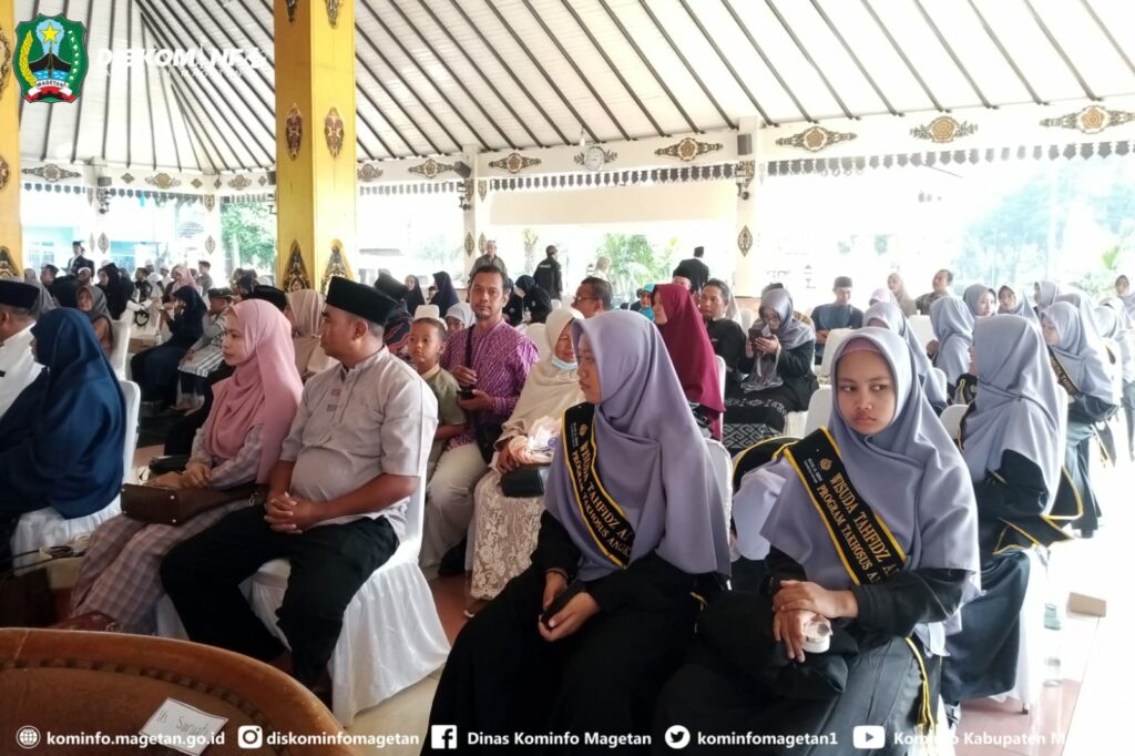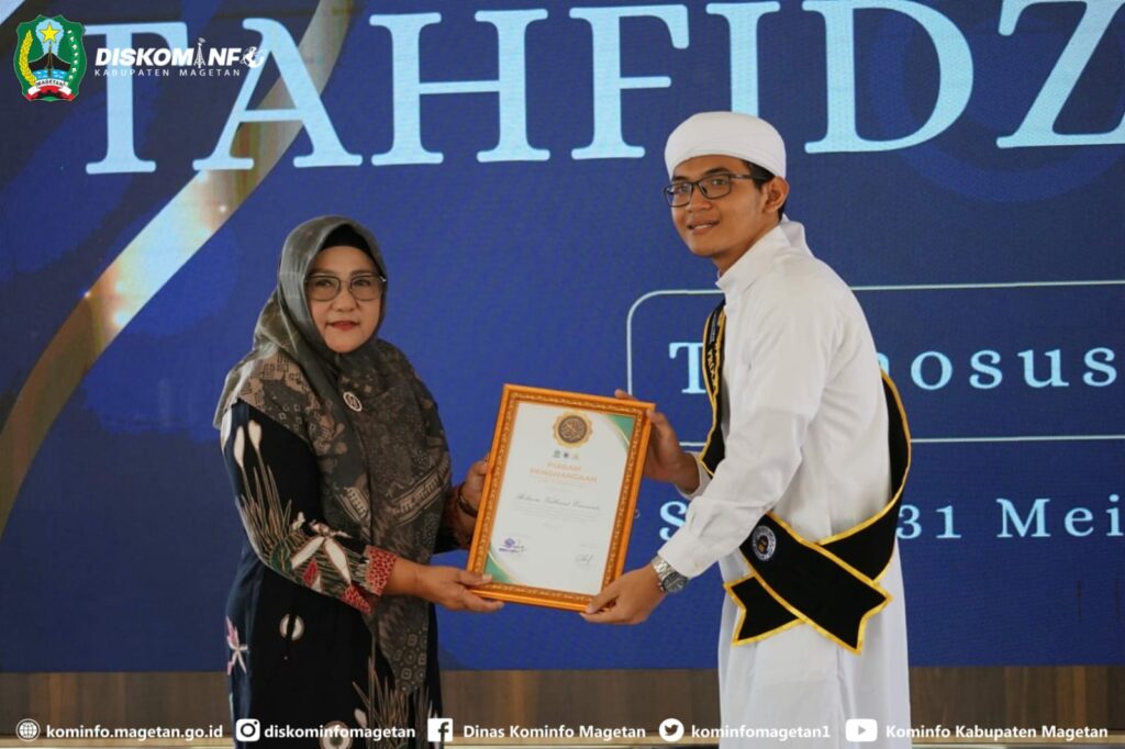 Prosesi wisuda tahfidz berlangsung haru dengan diserahkannya piagam penghargaan tahfidz kepada para santri secara simbolis oleh Bupati Magetan dan Dewan Pembina Yayasan Nur Rosyidah Ponpes Baitul Qur’an Al Jahro Magetan.