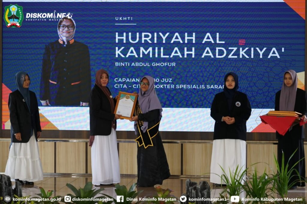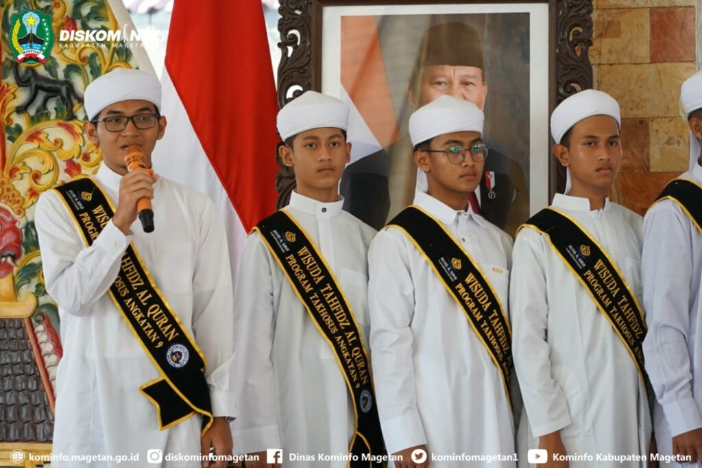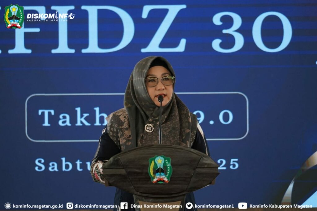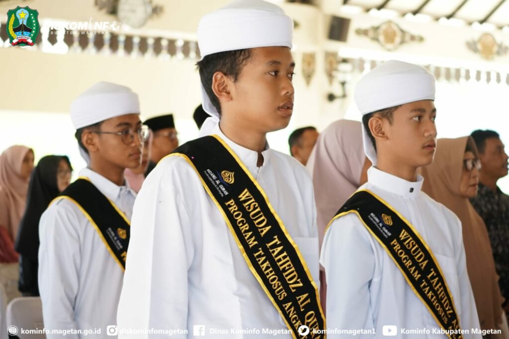 Hadir dalam wisuda tersebut Bupati Magetan Hj. Nanik Endang Rusminiarti, M.Pd., selain mengucapkan selamat kepada seluruh wisudawan program Takhossus, Bunda Nanik juga berpesan kepada para Tahfidz Qur’an untuk senantiasa menjaga hafalan hingga mengamalkan Al-Qur’an dalam kehidupan sehari-hari.